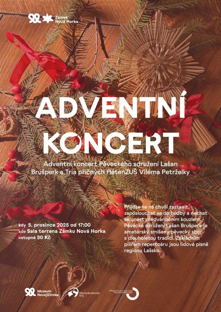 Zveme vás na adventní koncert, který se uskuteční 5. prosince 2025 od 17:00 v Sala terrena Zámku Nová Horka. Pěvecké sdružení Lašan Brušperk a Trio příčných fléten ZUŠ Viléma Petrželky přinesou jedinečné vystoupení plné hudební magie. Přijďte se na chvíli zastavit, zaposlouchat se do krásné hudby a nasát předvánoční atmosféru. Vstupné je 50 Kč a těšíme se na vaši návštěvu.